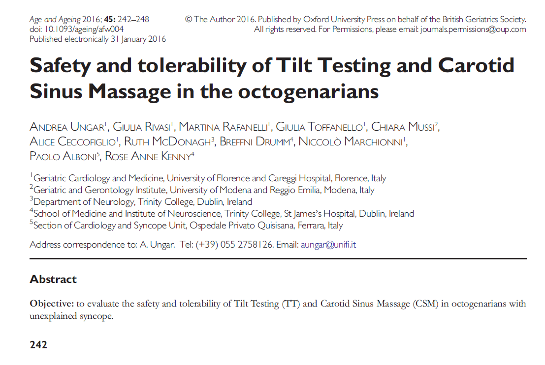 É stato pubblicato il lavoro "Safety and tolerability of tilt testing and carotid sinus massage in the octogenarians" sulla rivista inglese di geriatria Age and Ageing e svolto in collaborazione fra l'Università di Firenze, l'Università di Modena, l'Università di Dublino e Quisisana.