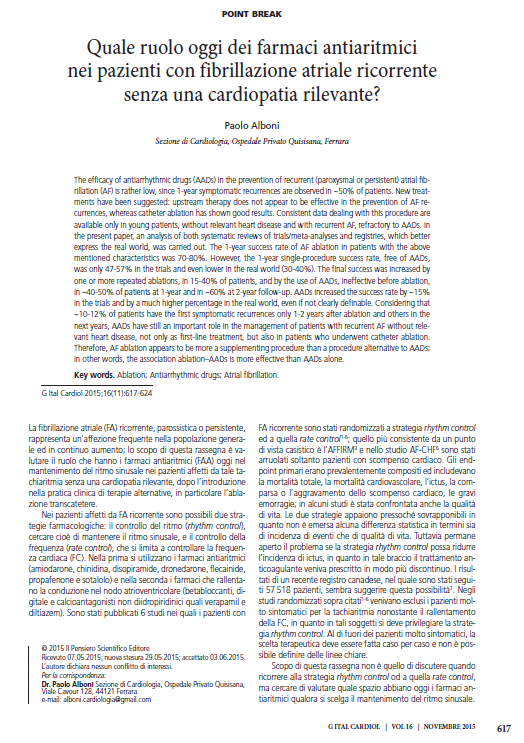 È stato pubblicato a nome di Quisisana sul Giornale Italiano di Cardiologia un nuovo lavoro del Dott. Alboni intitolato "Quale ruolo oggi dei farmaci antiaritmici nei pazienti con fibrillazione atriale ricorrente senza una cardiopatia rilevante?".