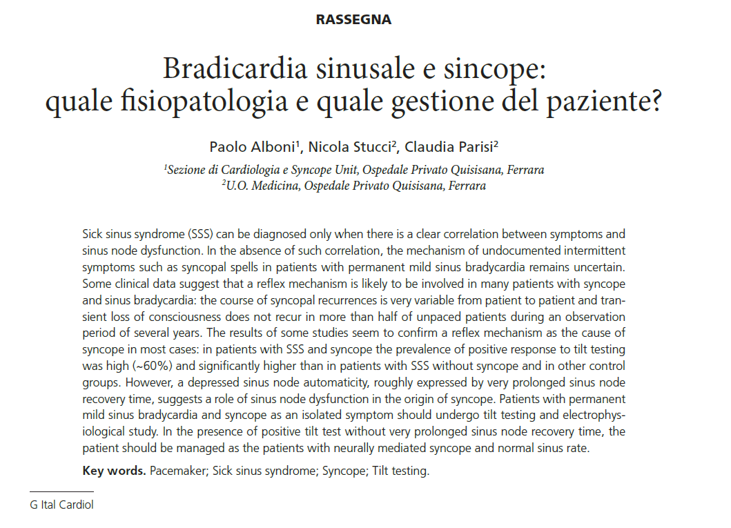 Il Prof. Alboni ha realizzato il lavoro "Bradicardia sinusale e sincope: quale fisiopatologia e quale gestione del paziente?", pubblicato come Quisisana sul Giornale Italiano di Cardiologia.